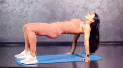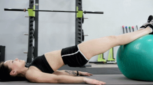 바닥에 등을 대고 똑바로 누운 후, 짐볼 위에 발을 올립니다. 그리고 복근과 엉덩이에 힘을 주며, 엉덩이를 천장 방향으로 들어 올리세요. 균형이 무너지지 않게 하고, 자세를 유지합니다. 그런 다음 짐볼을 끌어당겼다가 원래 자세로 되돌린 후, 엉덩이를 낮추면 1회가 완료됩니다. 1분 동안 반복합니다.