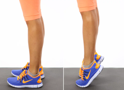 똑바로 서서 발을 엉덩이 너비만큼 벌립니다. 그리고 천천히 발뒤꿈치를 지면에서 떼어 공중으로 들어 올린 후, 다시 낮춰서 돌아오면 1회가 완료됩니다. 발을 올리거나 내릴 때는 3초 정도 카운트를 세면 도움이 되는데요. 동일한 움직임을 반복하여 1분 동안 운동하세요. 손에 물병을 들거나 덤벨을 들면, 운동 강도를 높일 수 있습니다.