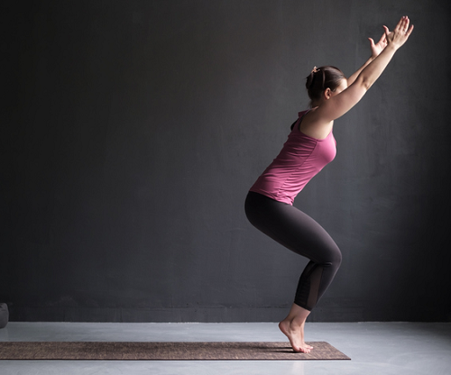 서서 진행하며 운동하는 내내 복근에 힘을 주고 있어야 합니다. 먼저 양손을 천장 방향으로 뻗어 올려서 붙이고, 시선은 정면을 향합니다. 그리고 무릎을 살짝 구부리고 엉덩이는 자연스럽게 의자에 앉는 포즈를 진행합니다. 그런 다음 발꿈치를 들고 자세를 유지하며 최대한 버티세요. 1분 동안 반복합니다.