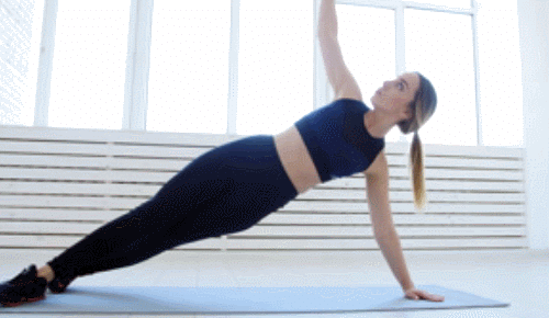 바닥에 엎드려서 어깨 라인과 손목 라인을 동일 선상으로 맞추는 기본 플랭크 자세로 시작합니다. 그리고 몸을 왼쪽으로 틀면서 오른쪽 팔을 공중으로 들어 올리는 사이드 플랭크 자세로 전환합니다. 그런 다음 오른쪽 팔을 아래로 내렸다가 올리는 동작을 30초 동안 반복하면 되는데요. 왼쪽 팔로 동일하게 30초 진행하며, 운동 중에는 자세가 흐트러지지 않도록 주의합니다.