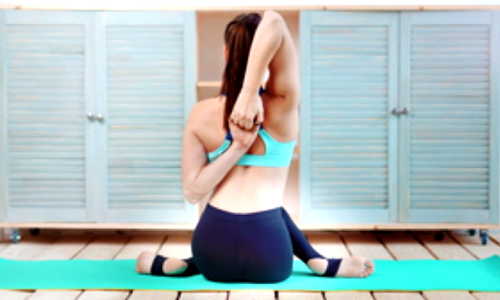 마지막으로 팔을 등 뒤에서 잡으면 되는데요. 오른팔을 들어 어깨 위로 가져가고, 왼팔을 등 아래에서 올려서 손을 맞잡으세요. 자세를 유지하며 호흡합니다. 팔의 위치를 바꿔가며 1분 동안 운동하세요.