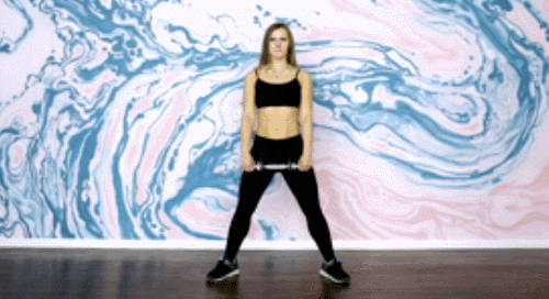 다리를 벌리고 서서 팔꿈치가 구부러지지 않도록 손을 모아서 케틀벨을 잡습니다. 그리고 엉덩이를 바닥으로 낮추면서 케틀벨을 끝까지 내렸다가 원래 자세로 돌아오면 1회가 완료되는데요. 시선은 정면을 향하고, 상체는 최대한 꼿꼿하게 펴며, 반복 운동하세요.