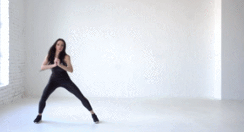 바닥에 서서 무릎을 약간 구부려서 엉덩이를 낮춥니다. 그리고 손은 가슴 앞에서 모으고, 상체는 최대한 편 상태를 유지하세요. 그런 다음 왼쪽 다리를 왼쪽 방향으로 크게 이동하면서 움직이면 되는데요. 좌우로 1분 동안 반복하여 운동합니다. 엉덩이를 낮출수록 운동 효과를 높일 수 있습니다.