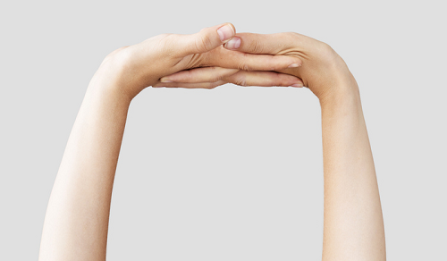 △ 앉거나 서서 운동할 수 있으며, 팔을 머리 위로 뻗어줍니다. 그리고 손가락을 깍지 껴 손을 전체적으로 늘여줍니다. 자세를 유지하며 스트레칭하고 원래 자세로 돌아옵니다. 1분 동안 진행하세요.
