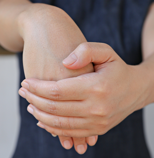 △ 오른팔의 팔꿈치를 구부리고 손바닥이 보이도록 위치합니다. 그리고 오른 손목을 오른쪽 방향으로 틀어주세요. 왼손으로 잡아주면서 손목을 자극합니다. 그런 다음 팔을 바꿔서 동일하게 반복하면 되는데요. 1분 동안 충분히 스트레칭하세요.