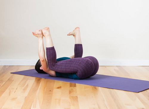 1) 땅바닥에 바로 누우세요. 무릎은 구부려 가슴으로 가져다 대고, 손으로 발의 바깥 가장자리 부분을 부여잡습니다.
