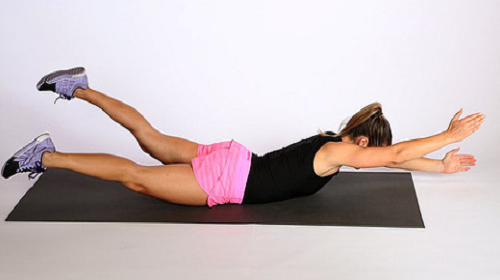 바닥에 배를 대고 엎드린 자세에서 수영을 하는 것과 같은 움직임을 반복하면 되는데요. 손과 발을 교차하여 공중으로 들었다가 내리는 동작을 진행합니다. 왼쪽 팔을 올리면서 오른쪽 다리를 들고, 오른쪽 팔을 올리면서 왼쪽 다리를 들어줍니다. 1분간 진행하세요.