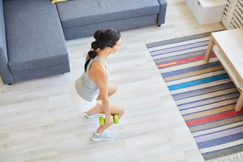 아령이나 물병을 활용하여 스쿼트 동작을 변형하여 진행할 수 있는데요. 바닥에 서서 양손에 아령을 잡고, 엉덩이를 낮췄다가 일어나는 동작을 반복하여 진행합니다. 이때 상체는 꼿꼿하게 편 상태로 유지하세요. 1분간 운동합니다.