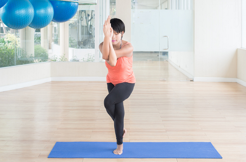 바닥에 똑바로 선 상태에서 왼발을 오른발 위로 교차한 후, 왼쪽 발등을 오른쪽 종아리 부분에 가져갑니다. 그리고 왼손을 오른손 위로 교차한 후, 팔을 꼬아서 겹치세요. 최대한 버틴 후, 팔과 다리의 교차하는 위치를 바꿔가며 1분 동안 진행하세요.