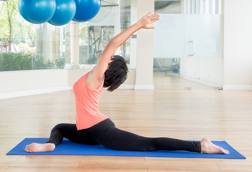 바닥에 선 상태에서 오른발을 앞으로 내딛으며 런지 자세를 만드세요. 그리고 손을 공중으로 뻗어주며 상체를 늘입니다. 그런 다음 시선을 손끝으로 향하며 자세를 유지하세요. 30초 운동 후, 왼발을 앞으로 내딛는 동작으로 30초 진행합니다.