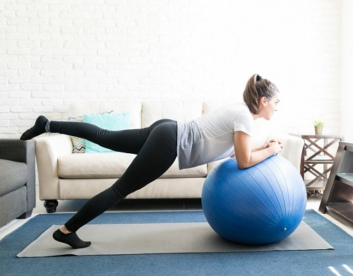 짐볼 위에 팔뚝을 대고 엎드리는 플랭크 자세를 만듭니다. 그리고 왼쪽 다리를 올려서 킥 동작을 추가하세요. 그러면 균형을 잡기 위해 더 많은 힘이 필요하며, 운동 효과를 높일 수 있는데요. 1분 동안 왼발과 오른발로 바꿔가며 진행합니다.