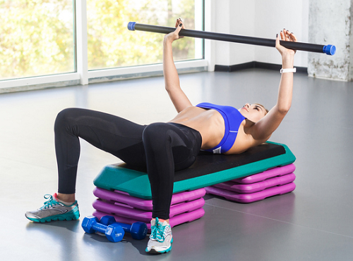 적당한 무게의 아령을 양손에 쥐고 스텝박스 위에 누워서 시작하세요. 머리부터 엉덩이까지 안정적으로 균형을 잡을 수 있도록 위치합니다. 그리고 팔꿈치를 구부리고 팔을 벌렸다가 팔을 모아주면서 공중으로 뻗어주는 동작을 진행합니다. 1분 동안 운동하세요.
