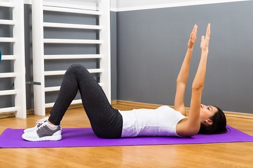 매트에 누워서 다리를 구부리고, 팔을 공중으로 뻗어주세요. 그리고 상체를 들었다가 내리는 싯업 자세를 반복하여 진행하면 되는데요. 1분 동안 반복하고, 배에 힘을 주면서 적당한 높이로 운동합니다.