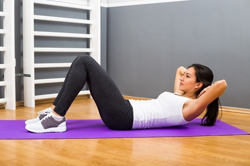 다시 등을 대고 매트에 누워서 머리 옆에 손을 가져가세요. 그리고 상체를 들었다가 내리는 크런치 자세를 반복하면 되는데요. 복부를 쥐어짜면서 1분 동안 운동합니다.