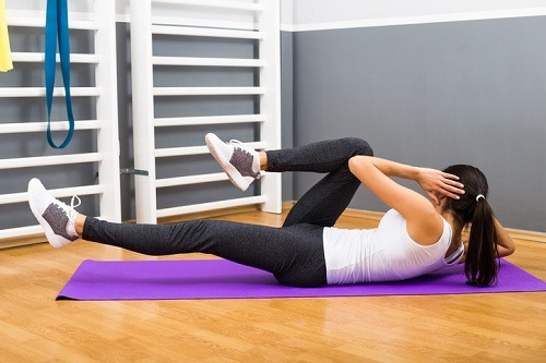 매트에 누워서 다리를 살짝 띄워줍니다. 손은 머리 옆에 위치하고, 오른쪽 무릎을 당기면서 상체를 오른쪽으로 틀어서 왼쪽 팔꿈치와 오른쪽 무릎의 거리를 가깝게 위치합니다. 그리고 원래 자세로 돌아오고, 왼쪽 무릎과 오른쪽 팔꿈치를 당겨 반복합니다. 1분 동안 진행하세요.