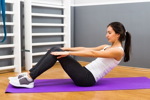 매트에 엉덩이를 대고 앉아서 무릎을 구부리고 발바닥을 붙이며, 상체를 뒤로 천천히 젖히면서 균형을 잡으세요. 코어에 힘을 주면서 버티고, 팔은 앞으로 뻗어줍니다. 그리고 V자 모양으로 버티거나 팔을 위아래로 움직이면서 동작을 추가하세요. 1분간 진행합니다.