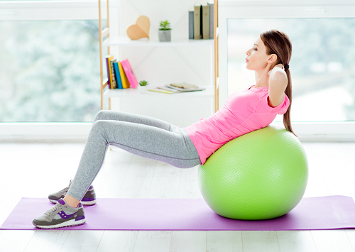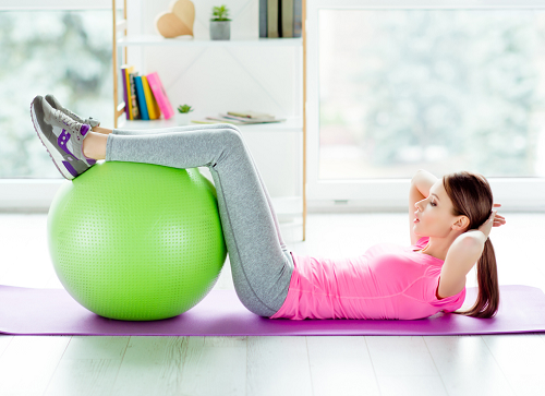 바닥에 누워서 다리를 들고, 짐볼 위에 올리세요. 그리고 짐볼을 당겨서 다리에 밀착합니다. 그런 다음 상체를 들었다가 내리는 크런치 동작을 반복하세요. 복부가 당길 수 있도록 적당한 높이로 들고, 천천히 원래 자세로 돌아가면서 운동합니다. 1분 동안 계속 반복하세요.