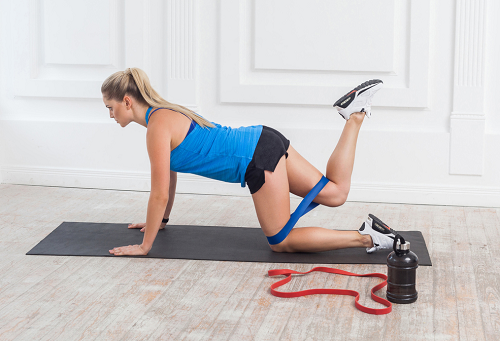 다리에 밴드를 끼우고 엎드려서 시작하세요. 손바닥과 무릎으로 몸을 지탱하고, 오른쪽 다리를 들어서 발바닥을 천장으로 향합니다. 그리고 엉덩이를 쥐어짜면서 다리를 들었다가 내리며 30초 운동합니다. 다리를 바꿔서 왼쪽 다리로 동일하게 30초 진행하세요.