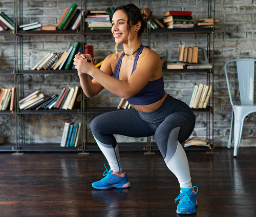 다리를 엉덩이 너비보다 넓게 벌리고 바닥에 서서 시작하세요. 양손은 가슴 앞에서 모아서 잡으세요. 그리고 시선은 정면을 바라보며, 상체는 꼿꼿하게 펴줍니다. 그런 다음 엉덩이를 바닥으로 내려서 스쿼트를 1회 하고 올라옵니다. 1분간 진행하세요.