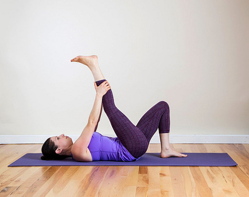 매트에 누워서 무릎을 세우고 발바닥을 고정하세요. 그리고 오른쪽 다리를 높이 들어줍니다. 무릎을 펴고, 양손으로 정강이 부분을 잡아줍니다. 그런 다음 당겨주세요. 10회 이상 호흡 후, 반대편 다리도 동일하게 진행합니다. 한쪽 다리를 드는 동작을 1분간 반복하세요.