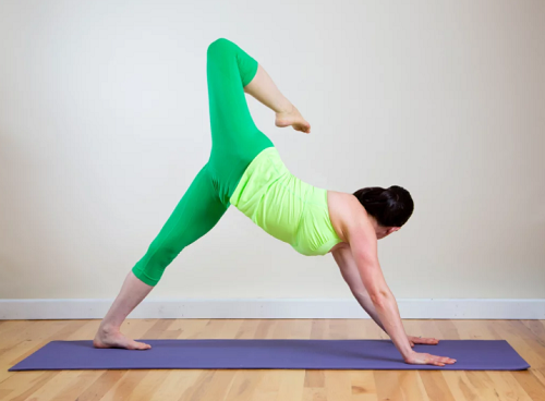바닥에 엎드려서 엉덩이를 공중으로 드는 다운도그 자세에서 시작합니다. 그리고 오른쪽 다리를 들고, 무릎을 구부려서 발끝이 왼쪽 방향을 가리킬 수 있도록 틀어주세요. 시선도 왼쪽을 바라봅니다. 자세를 유지하며 10회 이상 호흡하고, 원래 자세로 돌아와서 반대편 다리로 동일하게 반복합니다. 1분 동운 진행하세요.