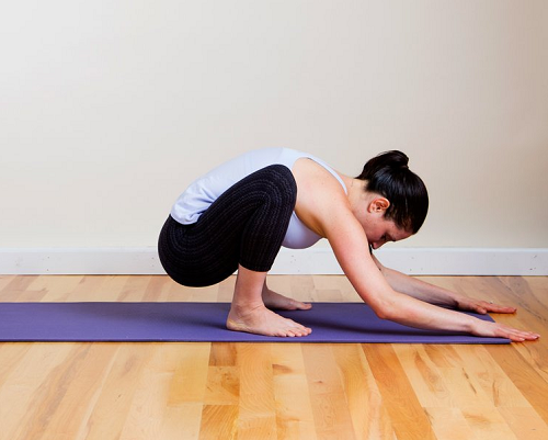 다리를 엉덩이 너비로 벌린 상태에서 스쿼트를 진행합니다. 자세를 낮추면서 엉덩이를 바닥으로 내리면 되는데요. 넘어지지 않을 정도로 완전히 내리고, 팔을 앞으로 뻗어서 손바닥을 바닥에 붙이세요. 그리고 심호흡을 진행합니다. 1분 동안 반복하세요.