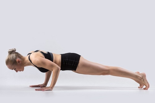 바닥에 기본 플랭크 자세로 엎드리세요. 그리고 팔꿈치를 구부려서 몸을 바닥으로 내려줍니다. 이때 상체만 내리는 것이 아니라 몸을 전체적으로 움직입니다. 그런 다음 팔꿈치를 구부린 상태를 유지하며 최대한 버팁니다. 1분간 반복하세요.