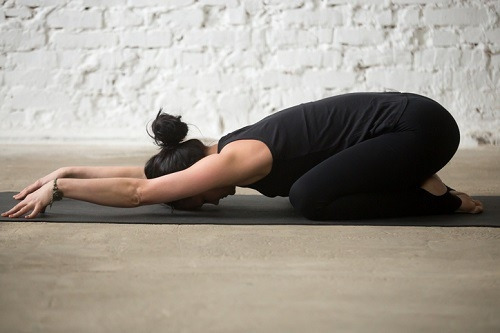 매트에 무릎을 꿇고 앉은 상태에서 상체를 앞으로 숙여주세요. 상체를 허벅지 위에 올린다는 느낌으로 최대한 구부립니다. 그리고 꼬리뼈를 기준으로 척추를 늘여줍니다. 팔은 몸 옆에 두거나 앞으로 뻗어서 손바닥을 매트에 붙입니다. 1분간 스트레칭을 진행합니다.