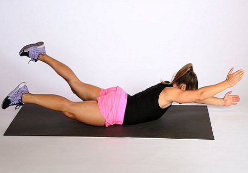 매트에 배를 대고 엎드린 상태에서 팔을 머리 위로 올립니다. 그리고 오른팔과 왼발을 올렸다가 내리는 동시에 왼팔과 오른발을 올려주세요. 1분 동안 팔과 다리를 번갈아 가면서 교차하세요. 시선은 바닥을 향하고, 리드미컬하게 운동합니다.
