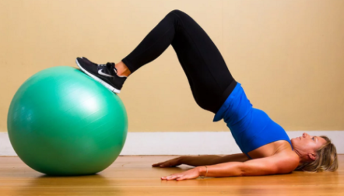 짐볼을 활용하여 브릿지 운동 강도를 높일 수 있습니다. 바닥에 누운 상태에서 짐볼 위에 발을 올리세요. 그리고 짐볼을 움직이면서 브릿지 자세의 높낮이를 조절할 수 있는데요. 1분 동안 진행하며, 넘어지지 않도록 중심을 유지합니다.