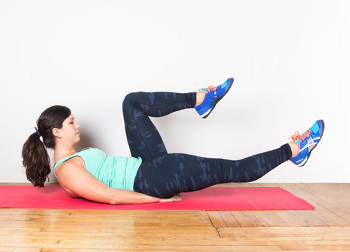 매트에 누운 상태에서 다리를 공중으로 들어주세요. 그리고 손바닥을 바닥에 지탱하고, 상체를 일으킵니다. 시선은 발끝을 향하고, 왼쪽 무릎을 당겼다가 되돌리고, 오른쪽 무릎을 당기는 동작을 연결합니다. 1분 동안 다리를 번갈아 당겨주세요.