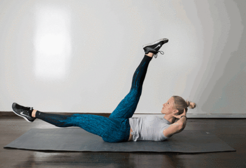 매트에 등을 대고 누운 상태로 시작하며, 다리를 공중으로 띄웁니다. 손은 머리 옆에 가져가고, 상체를 일으켜서 복부를 압박하세요. 그리고 오른발을 높이 들어 올렸다가 원래 자세로 돌아가고, 왼발을 높이 들었다가 내려줍니다. 1분간 다리를 교차하세요.