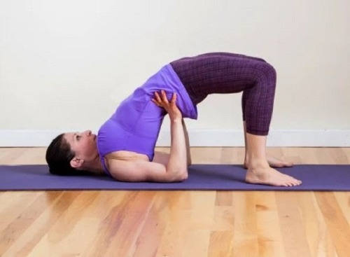 등을 대고 누운 상태에서 무릎을 구부리고 발을 붙입니다. 엉덩이에 힘을 주면서 공중으로 들어 올립니다. 손은 허리에 가져가고, 어깨로 지지하며, 최대한 버티세요. 10회 이상 호흡하고, 원래 자세로 돌아옵니다. 1분 동안 같은 동작을 반복하세요.