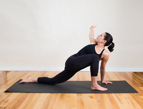 발을 모으고 매트에 선 상태에서 오른쪽 다리를 앞으로 크게 뻗습니다. 자세를 낮추고, 왼손을 바닥에 붙이세요. 그리고 상체를 왼쪽으로 개방하면서 오른손을 반대 방향으로 뻗어주세요. 자세를 유지하며 3초 이상 버팁니다. 그런 다음 왼쪽 다리를 앞으로 내딛고, 오른쪽으로 상체를 개방하며 운동하세요. 1분 동안 진행합니다.