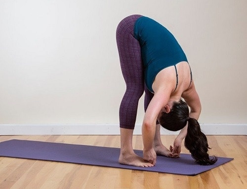다리를 엉덩이 너비로 벌린 상태로 서서 시작하세요. 그리고 상체를 숙이면서 몸을 구부리면 되는데요. 손을 바닥에 대거나 손가락으로 발가락을 잡는 동작을 이어갑니다. 호흡을 마셨다가 뱉으면서 상체를 하체와 가깝게 붙입니다. 1분간 진행하세요.