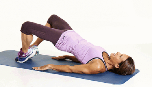 매트에 등을 대고 누운 상태로 무릎을 세우고 발을 붙입니다. 팔을 몸 옆에 놓고, 바닥으로 누르면서 엉덩이를 들어 올리세요. 그리고 발꿈치를 들고, 다리를 벌렸다가 오므리면 되는데요. 1분 동안 최대한 움직임을 반복하세요.