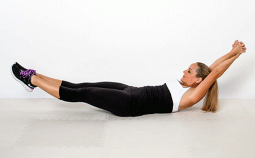 바닥에 등을 대고 누워서 손을 머리 위로 뻗으세요. 그리고 다리를 붙인 상태에서 공중으로 띄웁니다. 무릎이 구부러지지 않도록 하고, 최대한 뻗어주세요. 그런 다음 상체를 일으키면서 복부를 전체적으로 압박하세요. 1분간 버티는 자세를 반복합니다.