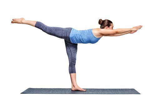 매트에 발을 모으고 서서 오른쪽 다리를 뒤로 뻗어줍니다. 동시에 상체를 앞으로 숙이고, 팔을 머리 앞으로 뻗어주세요. 시선은 손가락 끝을 향하고, 자세를 유지하면서 30초 버티세요. 왼쪽 다리를 뒤로 뻗는 동작으로 30초 반복합니다.