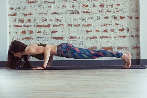 매트에 손바닥을 대고 엎드리는 기본 플랭크 자세에서 팔꿈치를 90도 각도로 구부리면서 팔을 굽히고 버티는 거미 자세를 만듭니다. 팔은 옆구리에서 떨어지지 않도록 붙이고, 엉덩이에 힘을 주면서 라인을 유지하세요. 1분 동안 진행하세요.