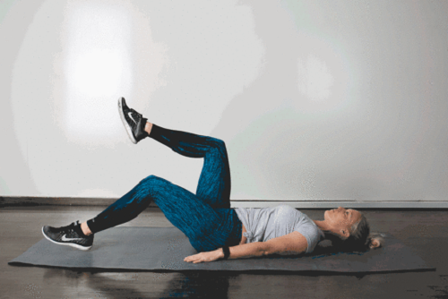 매트에 등을 대고 눕고, 다리를 공중으로 띄우세요. 그리고 오른쪽 무릎을 당기면서 동시에 양손으로 정강이를 감싸고, 원위치하세요. 그런 다음 왼쪽 무릎을 당기면서 감싸는 동작을 진행합니다. 1분 동안 다리를 당기는 움직임을 반복하세요.