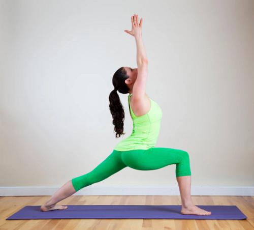 정면을 보고 다리를 모으고 서서 시작하세요. 그리고 오른쪽 다리를 오른쪽 방향으로 틀고, 크게 내딛으면서 무릎을 90도 각도로 구부리세요. 그러면 왼쪽 다리는 무릎이 완전히 펴지게 되는데요. 손을 머리 위로 올리고, 상체는 꼿꼿하게 유지하며, 시선은 손끝을 봅니다. 1분간 다리를 바꿔가며 진행하세요.
