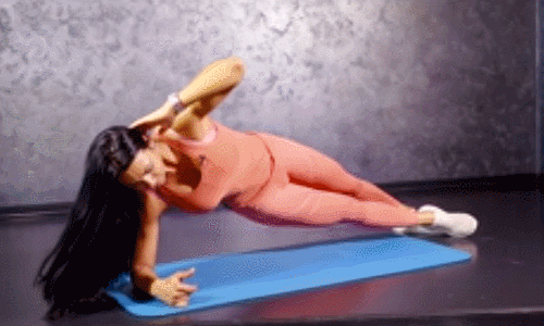 매트에 오른쪽 팔뚝을 대고 옆으로 누워서 왼손을 머리 옆으로 가져갑니다. 그리고 오른손을 당기면서 왼쪽 팔꿈치를 내려서 복부에서 만나도록 합니다. 30초 반복 후, 반대편 방향으로 옆으로 누워서 팔과 다리를 움직이는 동작으로 30초 진행하세요.