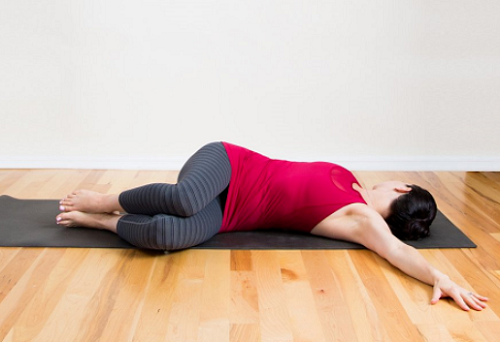매트에 등을 대고 누운 상태에서 팔을 양옆으로 벌리세요. 그리고 무릎을 세우고 발바닥을 바닥에 붙입니다. 그런 다음 다리를 왼쪽으로 넘기고, 시선을 오른쪽으로 돌립니다. 30초 반복 후, 다리를 오른쪽으로 넘기는 동작으로 30초 진행하세요.