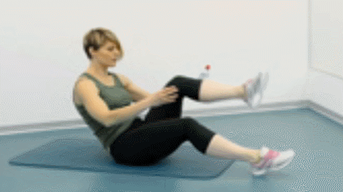 생수병이나 아령을 준비하세요. 매트에 엉덩이를 대고 앉은 상태에서 복부에 힘을 주고, 운동을 준비하세요. 그리고 왼쪽 다리를 공중으로 올리면서 오른손의 생수병을 왼손으로 옮기고, 원래 자세로 돌아온 후, 오른쪽 다리를 들면서 왼손의 생수병을 오른손으로 이동합니다. 다리를 교차하면서 1분간 진행하세요.