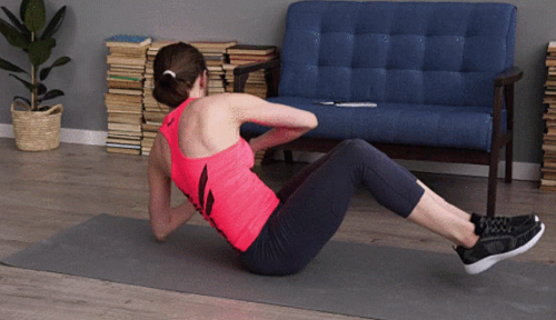 매트에 엉덩이를 대고 앉은 상태에서 다리를 띄우고, 상체를 뒤로 젖히면서 V 모양을 만듭니다. 무릎은 구부리고, 손은 가슴 앞으로 모아주세요. 그리고 상체를 왼쪽으로 틀었다가 오른쪽으로 트는 동작을 1분 동안 반복합니다.