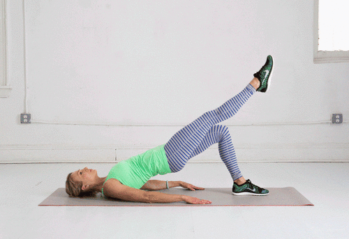 매트에 등을 대고 누운 후, 무릎을 구부리고 발을 붙이세요. 그리고 엉덩이를 들면서 브릿지 자세를 만듭니다. 그런 다음 오른쪽 다리를 뻗어서 엉덩이를 내렸다가 드는 업다운 동작을 30초 진행합니다. 이번에는 왼쪽 다리를 뻗고, 업다운 동작을 30초 진행하세요.