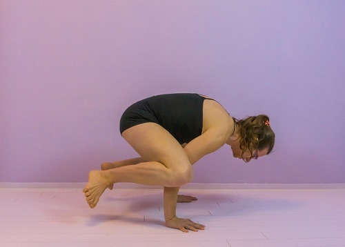 손바닥을 어깨너비로 벌리고 바닥에 댑니다. 그리고 다리를 당겨서 양쪽 손목 바깥 방향에 발을 붙입니다. 그런 다음 손으로 중심을 잡으면서 다리를 공중으로 띄우세요. 시선은 바닥으로 향하고, 밸런스를 잡습니다. 1분간 반복하세요.