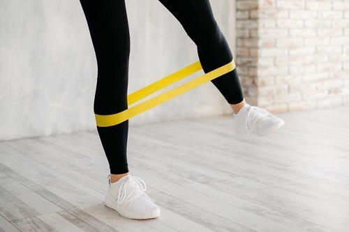 엉덩이 바깥의 볼륨을 키울 수 있는 운동으로 저항 밴드를 활용할 수 있는데요. 종아리에 밴드를 끼우고 서서 시작합니다. 왼쪽 다리를 왼쪽 방향으로 들었다가 내리는 동작을 30초 진행하세요. 이번에는 오른쪽 다리를 오른쪽 방향으로 들었다가 내리면서 30초 운동합니다.