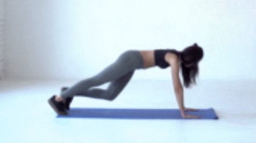 매트에 손을 대고 엎드려서 플랭크 기본자세를 만드세요. 몸이 구부러지지 않도록 팔꿈치와 무릎을 펴고, 몸을 곧게 유지하세요. 그리고 왼쪽 다리를 가슴 방향으로 당겼다가 되돌리고, 오른쪽 다리를 가슴 방향으로 당겼다가 되돌립니다. 1분 동안 다리를 교차하세요.