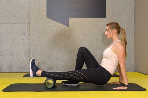 매트에 엉덩이를 대고 앉은 후, 다리를 펴줍니다. 그리고 왼쪽 다리 밑에 폼롤러를 두고, 오른쪽 다리는 무릎을 구부려서 발을 바닥에 붙이세요. 손바닥을 바닥에 대고, 엉덩이를 띄우며, 왼쪽 종아리를 마사지합니다. 폼롤러를 위아래로 굴려주세요. 다리를 바꿔가며 1분간 운동합니다.